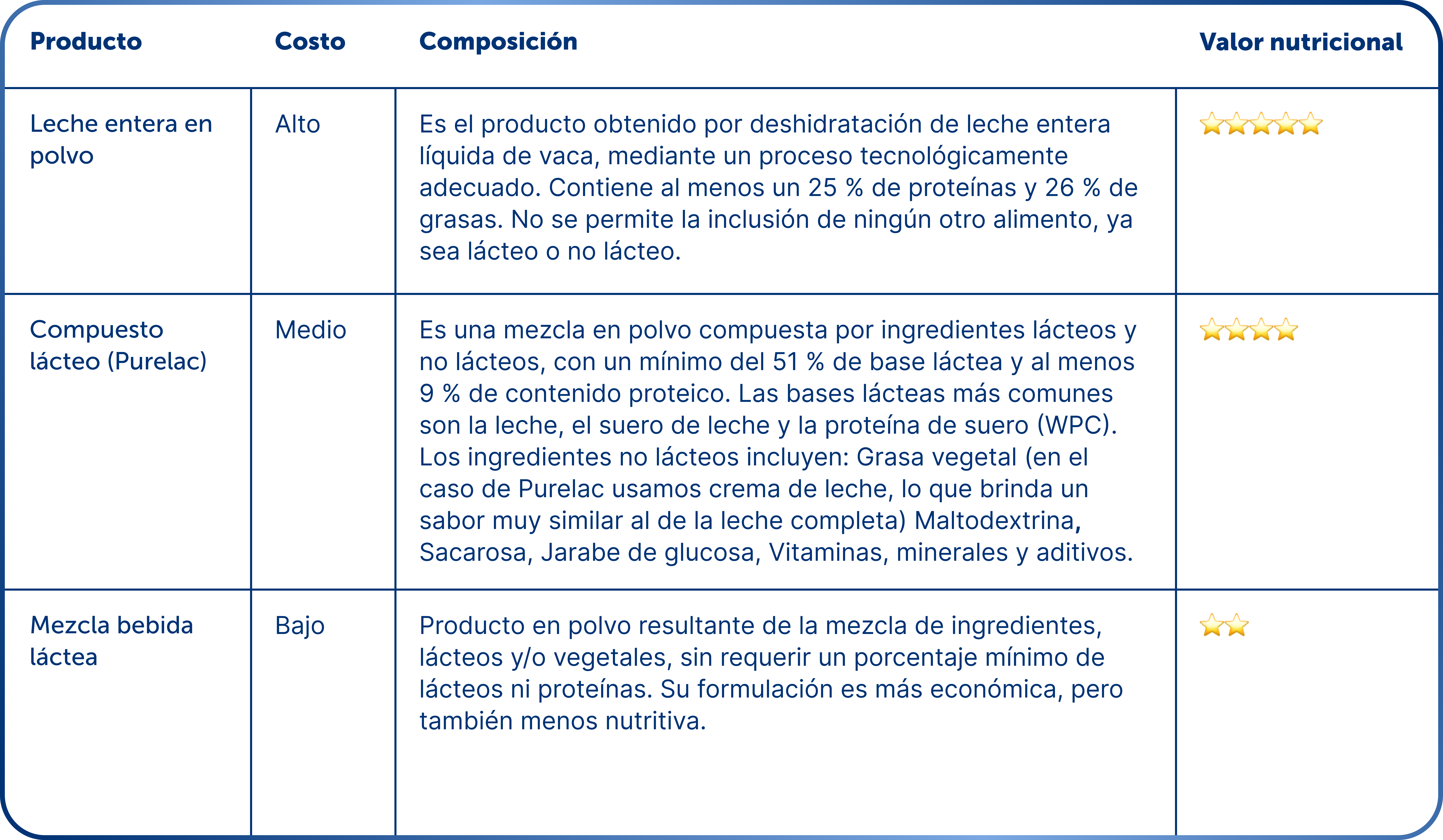Seguramente te has preguntado cuál es la diferencia. Un "compuesto lácteo" es simplemente una versión mejorada de la leche en polvo tradicional. La gran diferencia está en su proceso: lo fortificamos con ingredientes que le dan un sabor y una cremosidad inigualables, y lo enriquecemos con vitaminas y minerales esenciales. En el caso de Purelac, nuestro secreto es la inclusión de crema de origen animal en la fórmula, ¡para una experiencia láctea verdaderamente deliciosa! Es una forma inteligente de ofrecerle a tu familia la nutrición que necesita, con un sabor que les encantará y que además, cuida tu bolsillo.